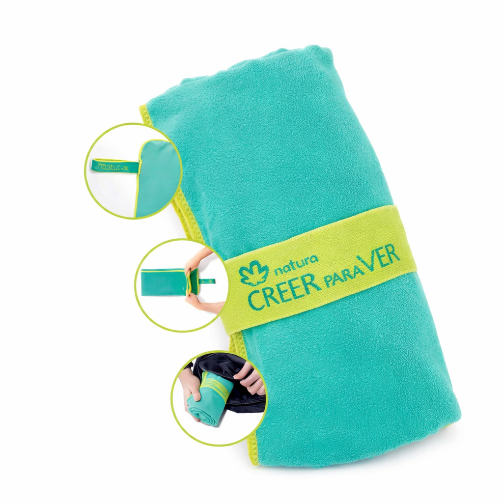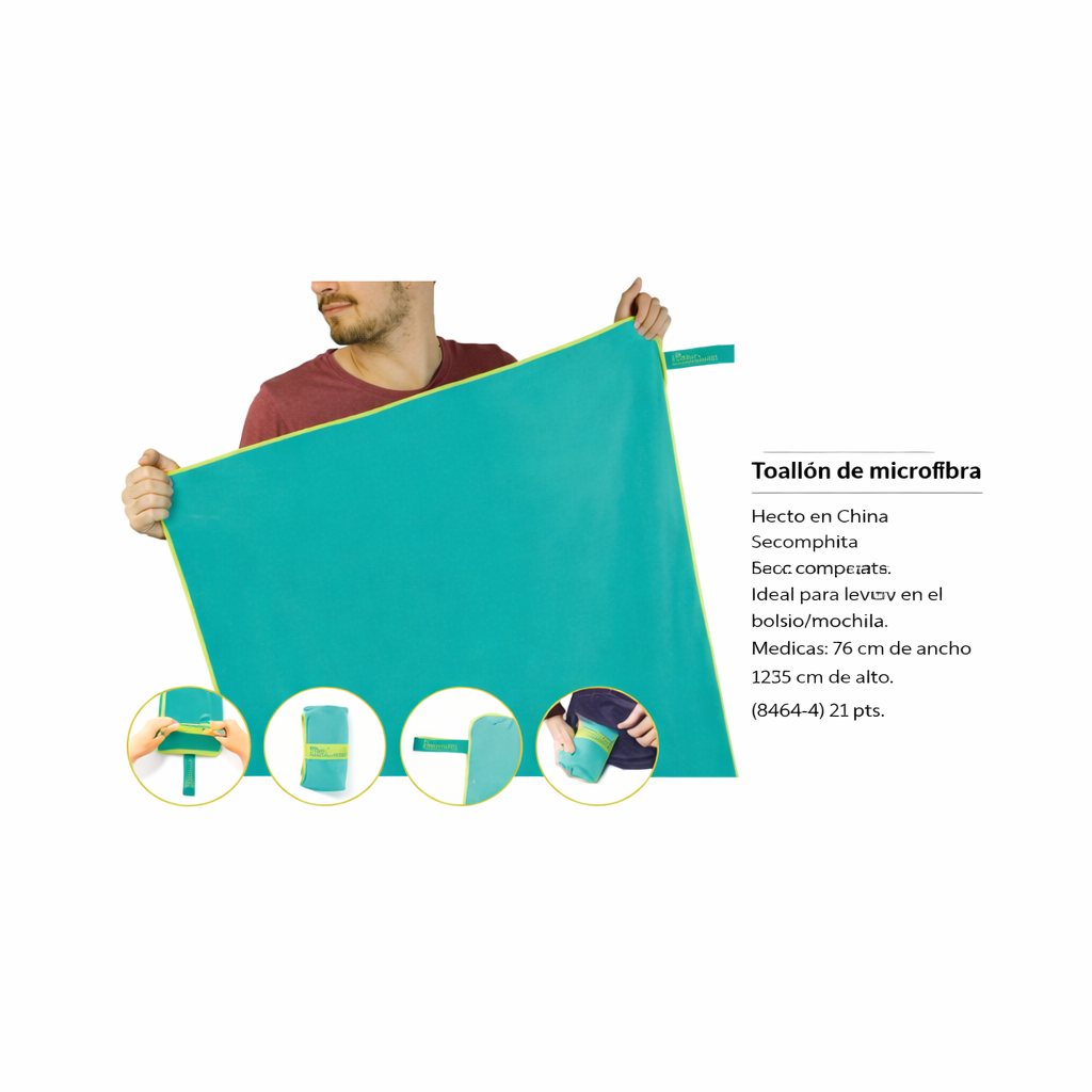 Seca rápido. Se comprime. Ideal para llevar en el bolso o mochila. Medidas: 75 cm de ancho x 125 cm de alto.